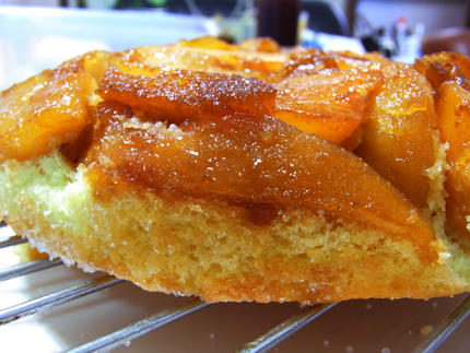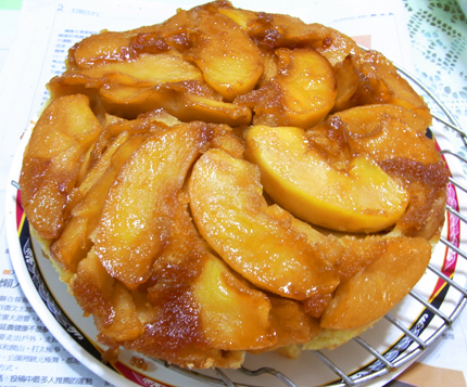 通常是用蘋果或是鳳梨,墊在烤模下烤上面倒蛋糕麵糊,烤完之後再翻轉過來