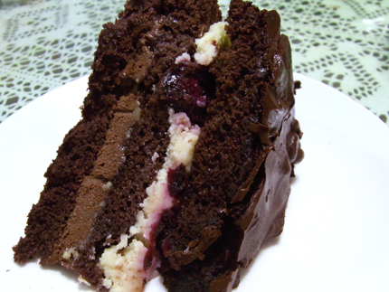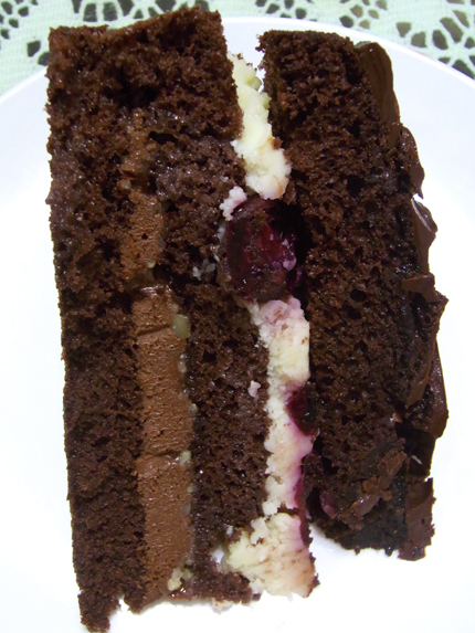 巧克力海綿蛋糕+巧克力慕斯+焦糖杏仁+巧克力海綿蛋糕+馬斯卡邦起司+萊姆酒櫻桃糖漿+糖漬櫻桃+巧克力海綿蛋糕+甘納許